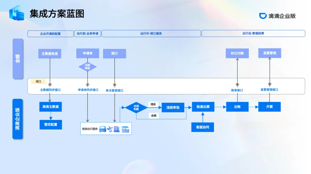 面对企业差旅出行场景的核心痛点,滴滴企业版与金蝶的合作为企业提供了系统性的解决方案。