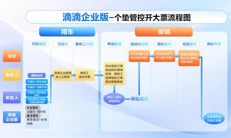 基于过往服务企业的成功经验,滴滴企业版结合高校需求,推出集“免报销”、“垫付报销”、“包干报销”多种类型在内的用车与支付服务,提升教职工报销便利与灵活。结算层面,滴滴企业版率先在高校领域推广“财务人员统一结算,滴滴开大票”的创新模式,帮高校告别“发票海洋”。